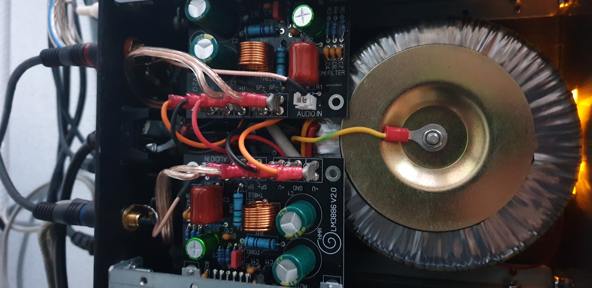 After hearing the LM3886 try-out of Jan in a small mediaplayer I decided to design my own LM3886 solid state amplifier. After reading many hours and trying some designs I finally convinced myself to design my own version of the LM3886 printed circuit board. Years ago I designed many printed circuit boards up to 8 layers and know the pitfalls. The pcb layout is one of the most important part of your design. The pcb contains input noise filtering and on the outputs are the often seen Thiele and Zobel (snubber) components for stability. I also read about the very interesting USA built switching power supplies of Connex, they make them especially for audio. A 300 Watt version powersupply can be found in the Helix amplifier beside the toroidal transformer as a base version.
